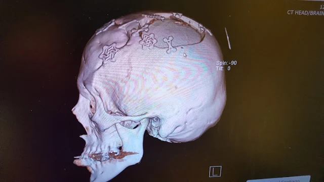 I am going to put some pictures of my post 2017 skull surgery here. These are MRI images. In the front area of my skull, there are star shaped things that are the clamps that hold my skull together where it was cut to remove the meningioma. Behind that there is a big "hole" space where the piece of skull with the tumor growing in it was removed. An implant was put into that space and it is held into place with a variety of clips and clamps.